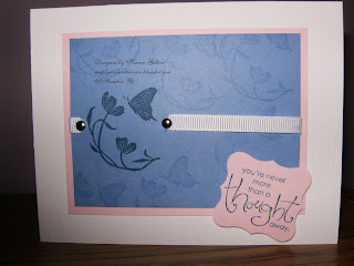 It seems so long between times that I can get to my blog. The card that I did is a sympathy card based on Saturday Sketch Challenge 140. You can see the different designs they send out and the beautiful cards that the designers have on the site for inspiration. http://stamping411.blogspot.com/ Take a look, you cannot help but be inspired.